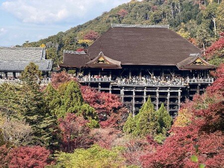特に、伏見桃山から比叡山に至る東山コースは、伏見稲荷や清水寺、南禅寺、哲学の道、銀閣寺等の観光地近くに登り口があるため、山歩きと観光地巡りをセットで楽しむことができます。2週間ほど前に東福寺近くから粟田口まで歩き、その途中、清水寺に立ち寄りましたが、人混みを避けて紅葉を楽しむことができました(清水の舞台は大混雑でした)。